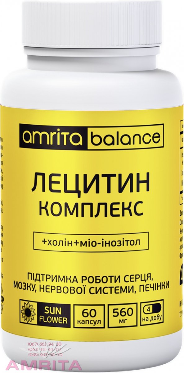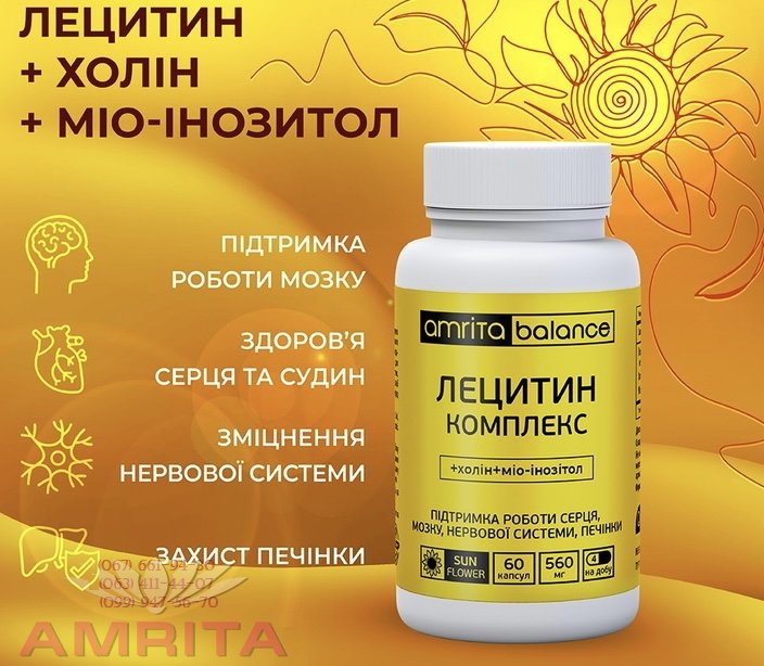 * впливає на синтез низки гормонів, зокрема пролактину, інсуліну, естрогенів, фолікулостимулюючого гормону, що дозволяє зменшити інсулінорезистентність, покращити функцію яєчників та сперматогенез.«Лецитин комплекс + холін + міо-інозітол» від Amrita – унікальний комплекс ненасичених жирних кислот і фосфоліпідів соняшникового лецитину (фосфатидилхоліну, фосфатидилінозитолу, фосфатидилетаноламіну, фосфатидилсерину), холіну та інозитолу для підтримки роботи мозку, серцево-судинної та нервової систем, відновленню та захисту клітин печінки. Сприяє нормалізації ліпідного обміну та рівня холестирину в крові.