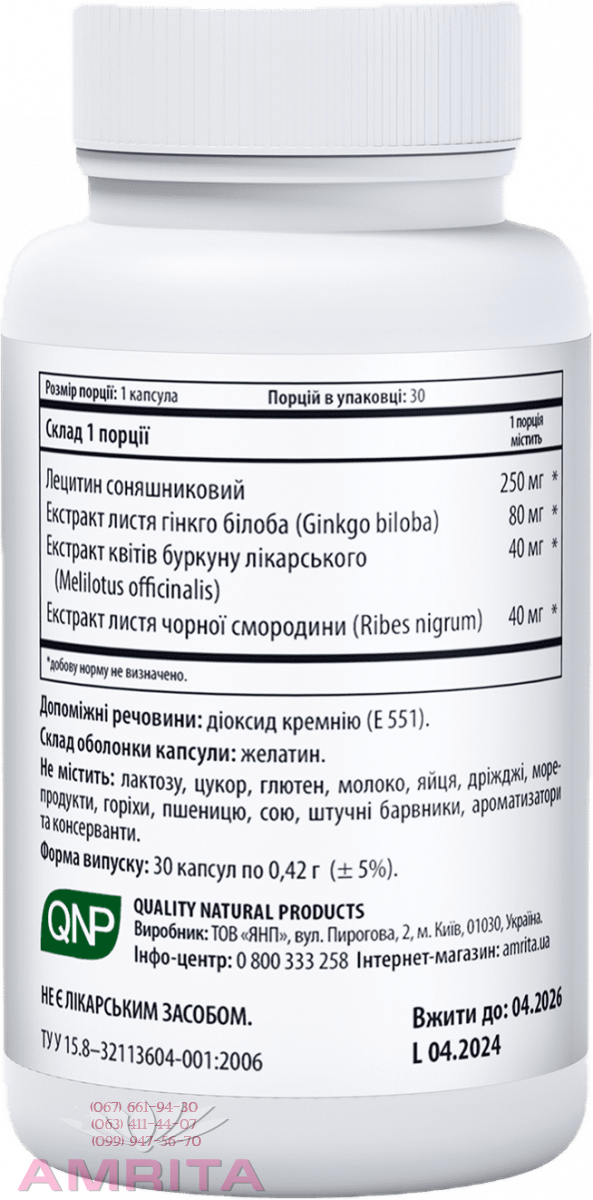 Состав на 1 капсулу: лецитин – 250 мг, экстракт листья гинкго билоба сухой – 80 мг, экстракт цветов донника лекарственного сухой – 40 мг, экстракт листья черной смородины – 40 мг; вспомогательные вещества: диоксид кремния; состав оболочки капсулы: желатин.