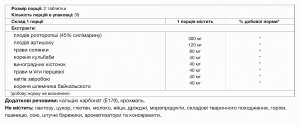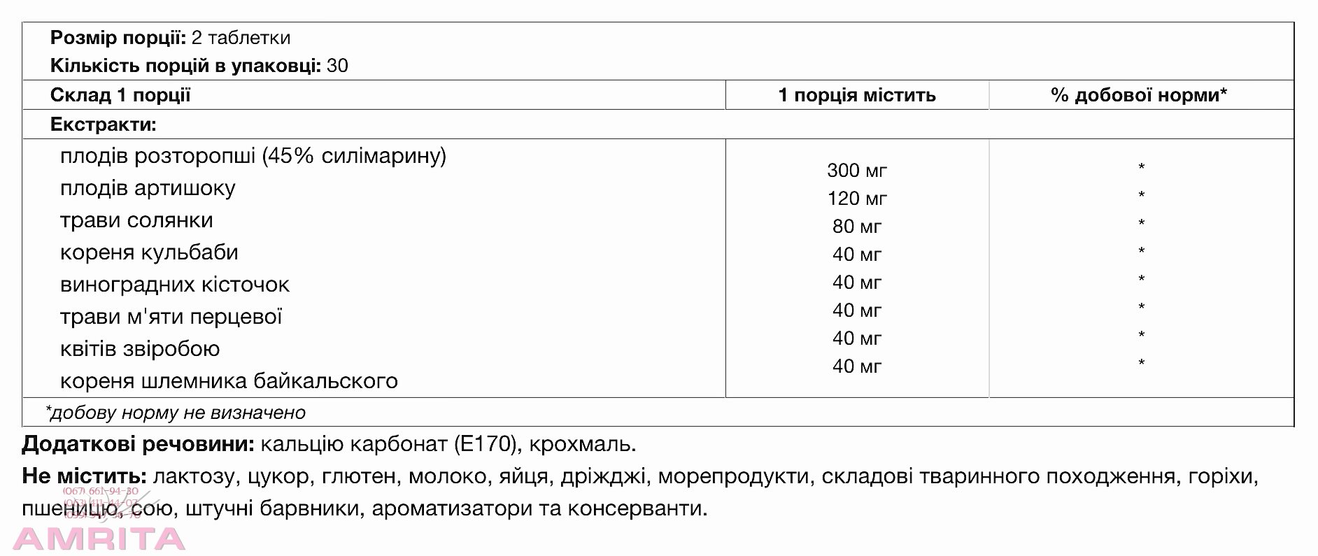 1 порція містить (екстракти) Кількість % добової норми* Плоди розторопші плямистої (Silybum marianum) 150 мг * Силімарин (з екстракту розторопші) 67,5 мг * Листя і кошики артишоку (Cynara scolymus) 60 мг * Трава солянки пагорбової (Salsola collina) 40 мг * Корінь кульбаби лікарської (Taraxacum officinale) 20 мг * Кісточки винограду культурного (Vitis vinifera) 20 мг * Листя м’яти перцевої (Mentha piperita) 20 мг * Трава звіробою (Hypericum sp.) 20 мг * Коріння шоломниці байкальської (Scutellaria baicalensis) 20 мг * * Добову норму не визначено