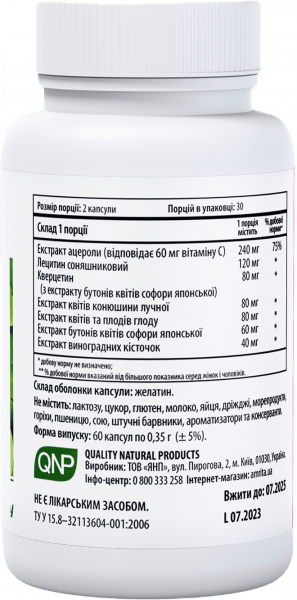 Состав: Состав активных ингредиентоа на 1 капсулу: кверцетин – 40 мг (mg), лецитин – 60 мг (mg) экстракты сухие: ацеролы (стандартизированный, соответствует 30 мг витамина С) – 120 мг (mg), цветов клевера лугового – 40 мг (mg), цветов и плодов боярышника – 40 мг (mg), бутонов софоры японской – 30 мг (mg), виноградных косточек – 20 мг (mg).