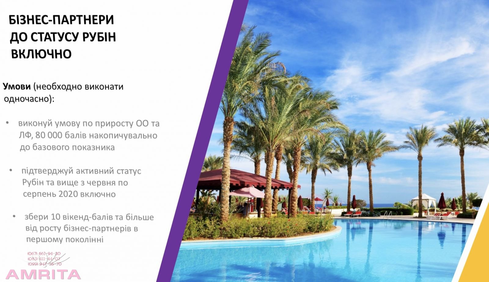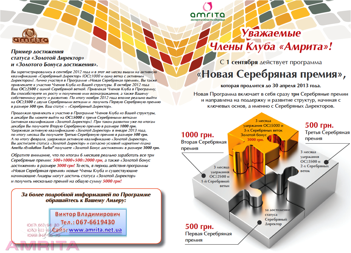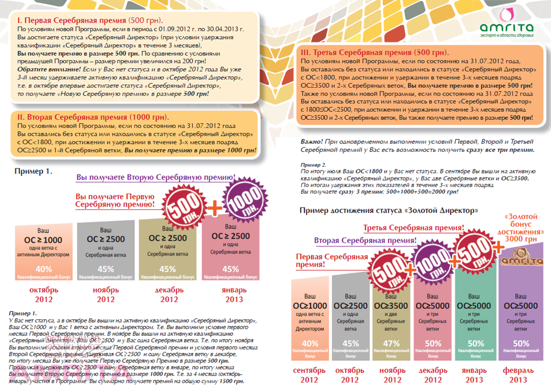 ** Об'єм Організації партнера в новому статусі повинен бути незалежним, тобто таким, який не входить в Об'єм Представництва (Консолідацію)Присоединяйтесь! Заполните и нажмите кнопку отправить. В чем преимущества бизнеса с АМРИТА ?Присоединяйтесь к программе лояльности – получайте кешбэк с персональных покупок и максимум преимуществ как постоянный клиент компании: