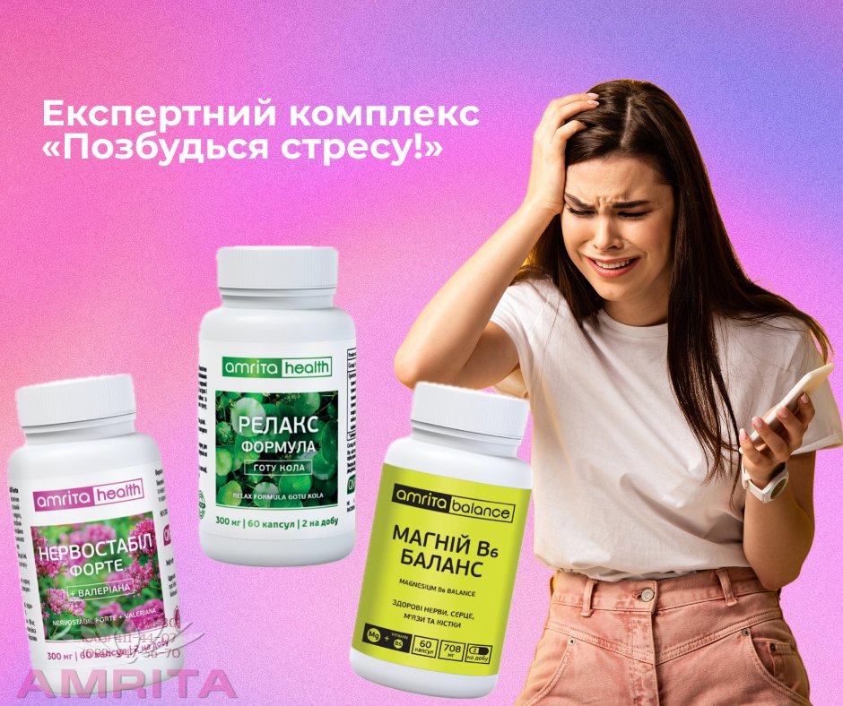 Мама у меня СТЕСС! Нечто подобное мы слышим по десятку раз на день. Мы уже настолько привыкли к состоянию стресса, что считаем его нормальной частью человеческой жизни.Но стресс - это не норма! Это нарушение баланса в организме человека возникает тогда, когда постоянно активирован механизм стресса. Мы чувствуем стресс, и это доставляет нам дискомфорт, препятствуя нормальной жизнедеятельности, и вредит здоровью.Как наконец избавиться от него, в чем найти опору и поддержку, как восстановиться, даже когда кажется, что это уже невозможно?Существует немало средств для борьбы со стрессом. Среди них биодобавки – натуральные комплексы на основе экстрактов трав, витаминов и минералов. Они укрепляют нервную систему и делают организм более устройчивым к стрессу.К борьбе со стрессом нужно подходить комплексно: наладить режим дня, принимать биодобавки, заняться любимым хобби, использовать ароматерапию, расслабляющие ванны.Некоторые эксперты советуют необычные способы при волнении и нарастающей тревожности, например, вдохнуть запах апельсина, решить головоломку или погладить домашнего питомца.Очень действенным способом может стать периодический отдых от гаджетов. Ведь в наше время переизбыток информации и особенно плохих новостей держат нас в напряжении и расшатывают нервную систему.Психологи советуют попробовать разные методы борьбы со стрессом и найти свой. Ведь кому-то лучше всего помогают медитации и расслабление, а кому-то, наоборот, активный спорт и смена деятельности.Когда тревожность все нарастает, обращаться к специалистам за медикаментозной поддержкой еще рано, но нормализовать психологическое состояние самостоятельно уже не получается, стоит ввести в рацион специальные бады.Антистрессовые БАДы от Амрита – лучшие фитопрепараты для нервной системыЛинейка натуральных успокоительных средств на растительной основе от Амрита – ваш надежный помощник в сложных ситуациях!БАДы имеют накопительный эффект, но действовать начинают уже через полчаса после приема.Нервостабил: природный антидепрессант поможет наладить сладкий сон, успокоит при гормональных встрясках и вернет вам радость жизни.