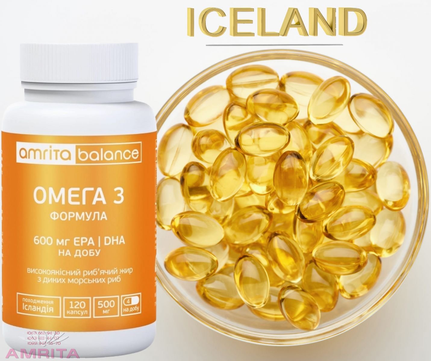 Применение продукта «Омега 3 формула» способствует уменьшению риска сердечно-сосудистых заболеваний: атеросклероз, ишемическая болезнь сердца, артериальная гипертензия, инсульт, инфаркт миокарда и др.Благодаря кооперации передовых ученных и лучших производителей, ГК Амрита, в 2021 году начинает поставки на рынки Украины и Европы, не имеющий аналогов продукт : Комплекс Омега-3. Состав на 1 порцию (3 капсулы): концентрированный рыбий жир – 1500 мг, Total Omega (общее количество Омега 3) – 864 мг, EPADHA (общее количество на порцию) – 728 мг, EPA эйкозапентаеновая кислота – 435 мг, DHA доксозагексаеновая кислота – 293 мг. Не содержит: лактозу, глютен, сою, ГМО, тяжелые металлы и свинец.