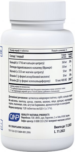 Компонент Кількість у порції (4 таб.) % добової норми Кальцій (з 1716 мг цитрату) 360 мг 30% Колаген гідролізований (Франція) 330 мг * Магній (з 333 мг цитрату) 50 мг 10% Вітамін C 30 мг 38% Вітамін D3 10 мкг 200% * добова норма не визначена