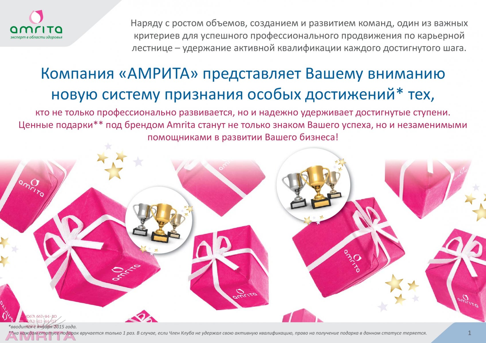 В системе признания участвуют партнеры которые вступили в клуб "Амрита" с 1 января 2015 г. Напоминаем, что с 1 января, действует обновленный Маркетинг-план Компании «Амрита», который предлагает Членам Клуба выгодные возможности сотрудничества.