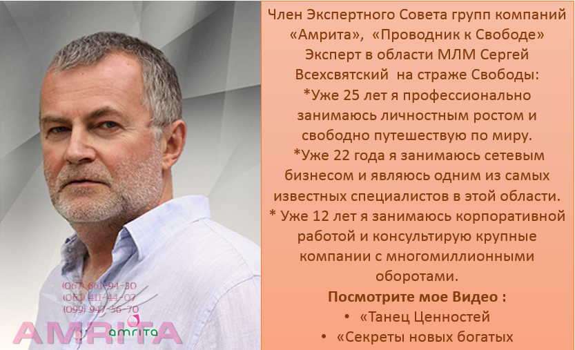 Cамый Выдающейся Лидер МЛМ Сергей Всехсвятский в апреле 2015 года предложил свои услуги по внедрению Лидерских стратегий Лучших МЛМ разработок за последние 20 лет! Компания «Амрита» с гордостью представляет нового члена Экспертного Совета Группы Компаний «Амрита», который принимает активное участие в разработке и будет принимать участие по внедрению новой стратегической программы - Сергея Всехсвятского. Сергей Всехсвятский - признанный эксперт в вопросах сетевого бизнеса, сетевик-практик с огромным профессиональным опытом, аналитик, консультант и тренер в сетевой индустрии. Посмотреть мотивационный ролик с участием Сергея Всехсвятского Вы можете по ссылке:-------->>>>>