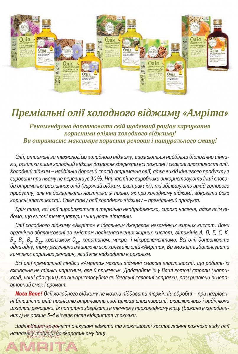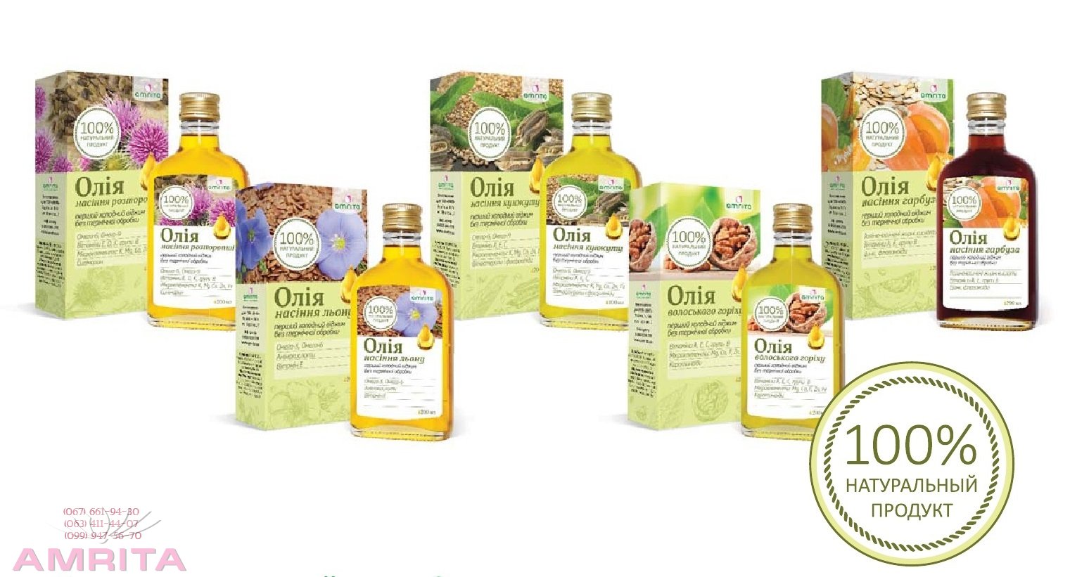 Масла холодного отжима «Амрита» являются идеальным источником незаменимых жирных кислот, витаминов А, D, E, C, K, B1, B2, B3, B12, коэнзимов Q10, каротина, макро- и микроэлементов.Премиальные масла Amrita Nutrition - это: 1. Максимум полезных свойств и натурального вкуса благодаря использованию: