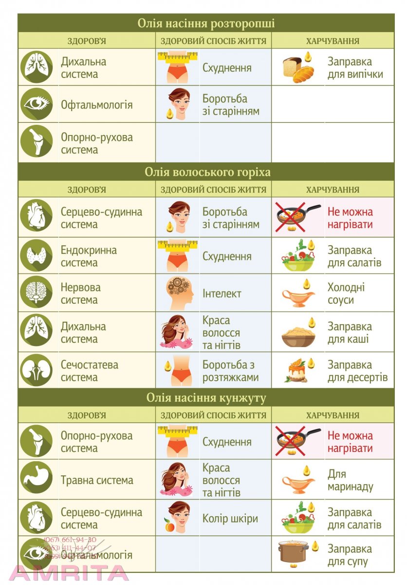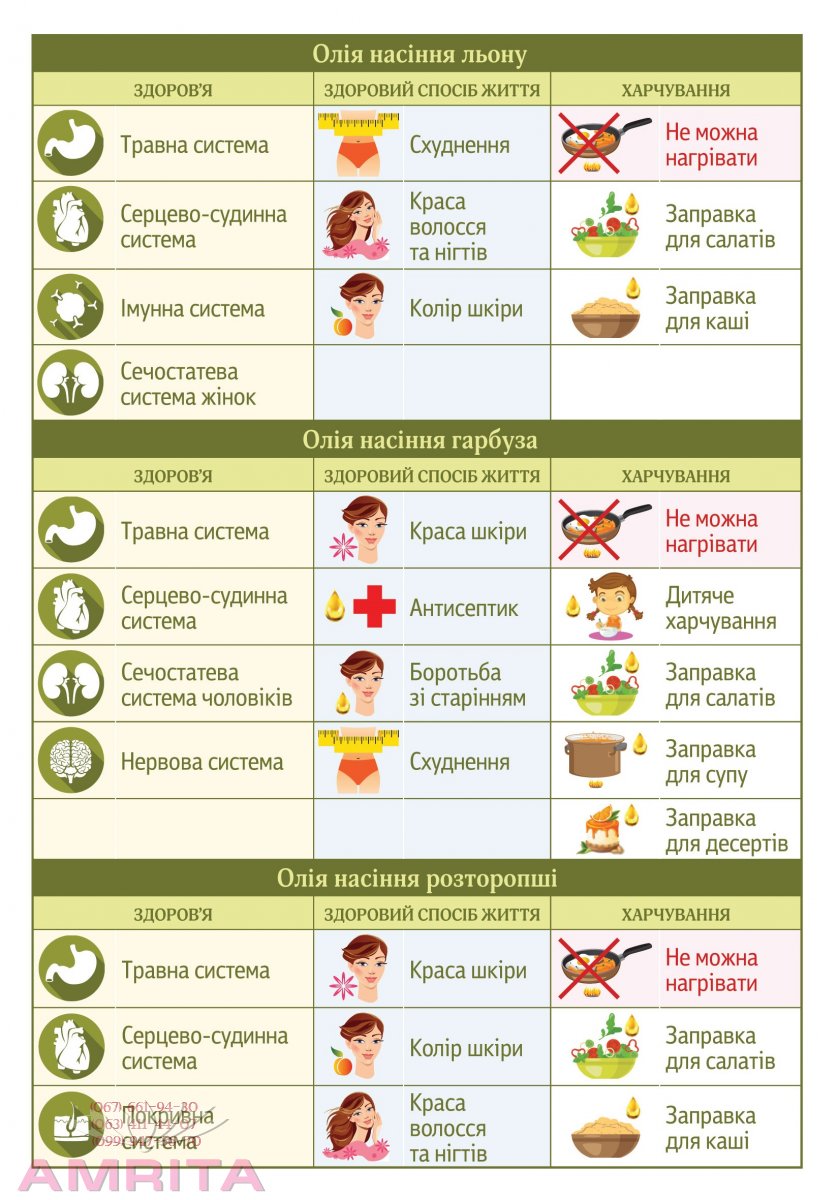 Масла, полученные по технологии холодного отжима, сохраняют все питательные и вкусовые вещества. Технология холодного отжима - наиболее дорогой способ получения масла, поскольку выход конечного продукта из сырья не превышает 30%. Не все компании могут себе это позволить. Чаще всего производители используют другие способы получения растительных масел (горячий отжим,экстракция). Это помогает увеличить выход готового продукта, но не позволяет в полной мере сохранить его полезные свойства. Все масла «Амрита» производятся из термически необработанных, сырых семян, чтобы сохранить все витамины. Мы всегда ставим качество продукта на первое место, именно поэтому наши масла проходят постоянный контроль качества, в том числе, в аккредитованных лабораториях Украины. Для ПРОСМОТРА ТАБЛИЦЫ в полном размере- кликните по фото!