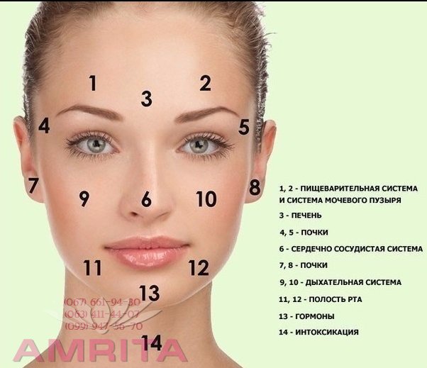 О наличии тех или иных внутренних нарушений может говорить цвет кожи, сосудистый рисунок, влажность лица и даже глубина морщин и их расположение. Каким же образом связать прыщи на лице с заболеваниями и проблемами и внутренними болезнями? Вот список взаимосвязей участков вашего лица и заболеваний, признаки и симптомы которых отражаются на них: