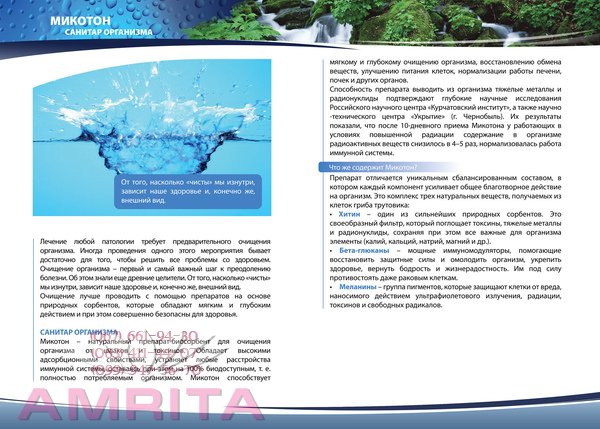 1. МИКОТОН - один из самых сильных биосорбентов. Он эффективно удаляет токсины, попадающие в организм с водой и пищей, в том числе тяжелые металлы, радионуклиды и шлаки, накапливающиеся при нарушениях работы печени, почек и желудочно-кишечного тракта. В отличие от традиционных сорбентов МИКОТОН действует избирательно, захватывая и выводя вредные вещества и оставляя в организме полезные и важные микро-, макроэлементы, витамины, белки, углеводы. МИКОТОН - это первый «умный» биосорбент.
