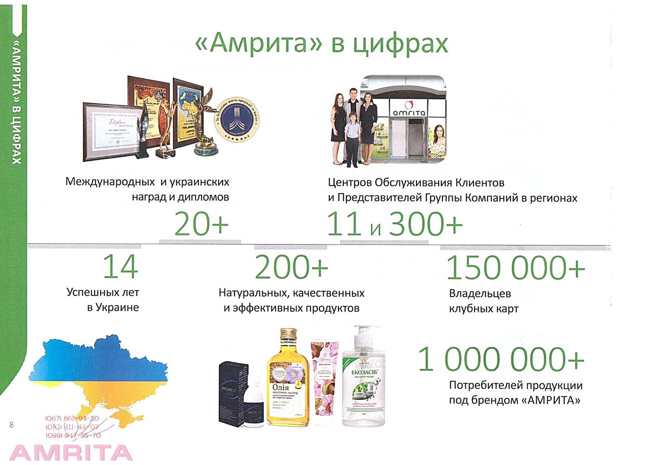 «Амрита» – компания №1 среди украинских компаний прямых продаж. В нашем ассортименте представлена качественная натуральная продукция в 4-х направлениях: «Амрита» постоянно расширяет ассортимент продукции с целью удовлетворения потребностей своих клиентов и поддержки развития бизнеса наших Лидеров. Мы предлагаем своим бизнес-партнерам простую возможность получать устойчиво растущий доход от 10 000 грн. ежемесячно благодаря созданию и развитию своей дистрибьюторской структуры и команды Лидеров.