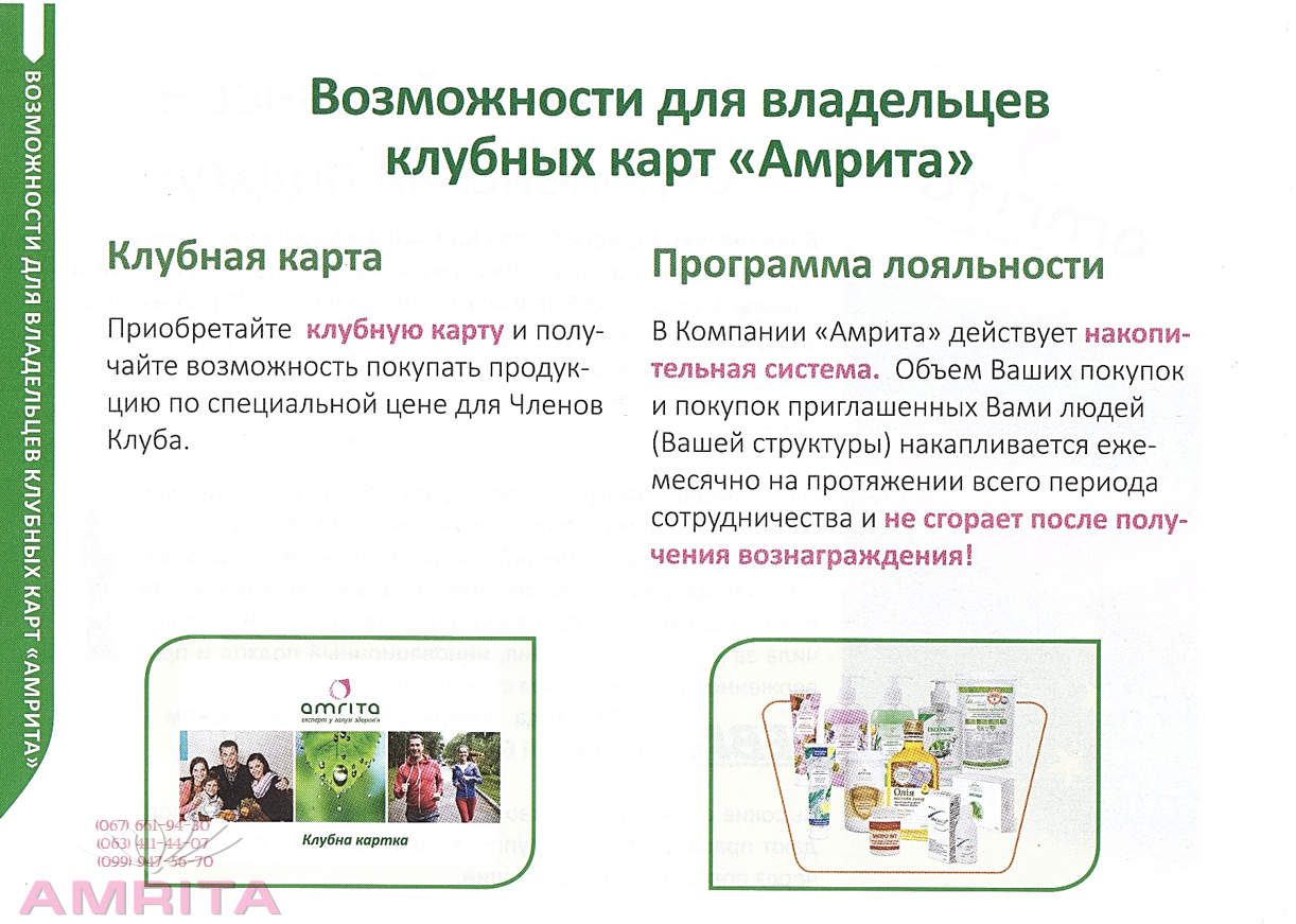 Это возможно только в «Амрите»! 2. Самый простой способ получать устойчивый дополнительный доход - приглашайте новых Членов Клуба, заинтересованных в продукции или в дополнительном доходе. Совет: найдите хотя бы одного человека, который, также как и Вы, заинтересован в дополнительном доходе, и обеспечьте себе устойчивый дополнительный доход. 3. Самые надежные инвестиции своего времени в собственный бизнес - формирование команды Лидеров. Совет: сформируйте команду из пяти Лидеров, ориентированных на создание собственного бизнеса с Компанией и получите стабильно растущий бизнес и финансовую независимость. Компания «Амрита» предоставляет возможность передать свой бизнес по наследству и тем самым обеспечить будущее своим детям и близким. НОВОЕ БИЗНЕС-ПРЕДЛОЖЕНИЕ: Создавайте бизнес «под ключ» путем открытия Сервисного пункта или офиса VIP-Лидера. Компания "Амрита" стала Экспертом в области здоровья на Украине: Преимущества продуктов под Брендом «Амрита» на рынке неоспоримы: