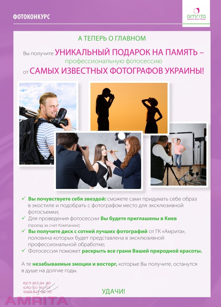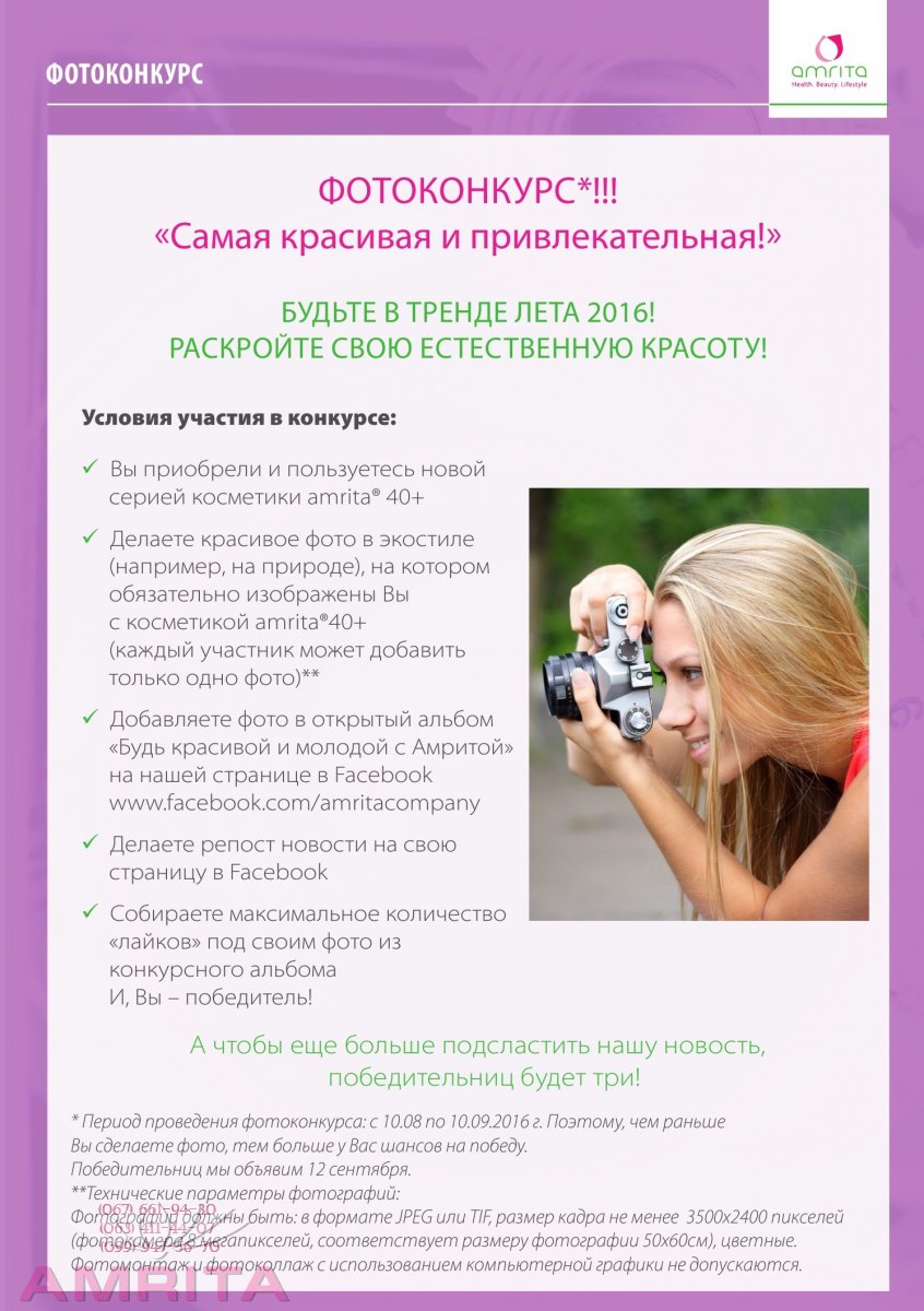 Любите фотографироваться в экостиле и делиться своими лучшими фотографиями в социальных сетях? Тогда смело принимайте участие в фотоконкурсе - «Самая красивая и привлекательная»! Становитесь победителем и получайте уникальный подарок - профессиональную фотосессию от самых известных фотографов Украины! С подробными условия фотоконкурса Вы можете ознакомиться в плакатах ниже. Фотоконкурс «Самая красивая и привлекательная» - это прекрасная возможность показать себя и получить незабываемые эмоции вместе с Компанией «Амрита»! Конкурс проводится c 10.08.16 по 10.09.16