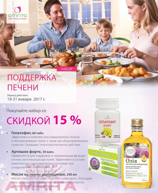 "Печень вылазит из под ребра, в грудине горит огнем, язык прилипает к небу, а голова гудит как пустой казан, в далеком родном селе Нижняя Апша, на Закарпатье. Зашел вчера к Богдану, в мед центр и на двери увидел: "Люди берегите печень , пока ЖИВЫ"! Что делать? Мама, караул! И тут знакомый подсказал за акцию в Амрите : Восстановите свой организм после праздничных дней! Покупайте набор«ПОДДЕРЖКА ПЕЧЕНИ» со СКИДКОЙ 15%! Период действия предложения: 19 - 31 января 2017г. Состав набора: