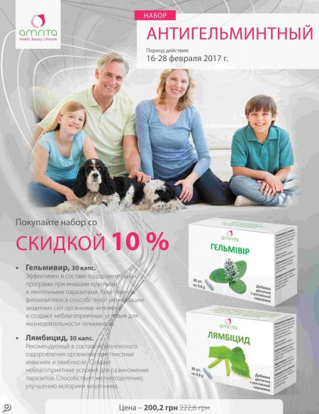 Существует множество химиопрепаратов для лечения глистных инвазий которые можно купить в аптеке. Но все они имеют побочные явления в виде тошноты, диареи, нейротоксических эффектов, аллергических реакций и т.д. Покупайте Акционный набор : Антигельминтный. СКИДКА 10%! С 16-28 февраля 2017 г. со СКИДКОЙ 10 % . Эффективен в составе оздоровительных программ при инвазии круглыми и ленточными паразитами. Компоненты фитокомплекса способствуют активизации защитных сил организма человека и создают неблагоприятные условия для жизнедеятельности гельминтов. Рекомендуемый в составе комплексного оздоровления организма при глистных инвазиях и лямблиозе. Создает неблагоприятные условия для размножения паразитов. Способствует желчеотделению, улучшению моторики кишечника.