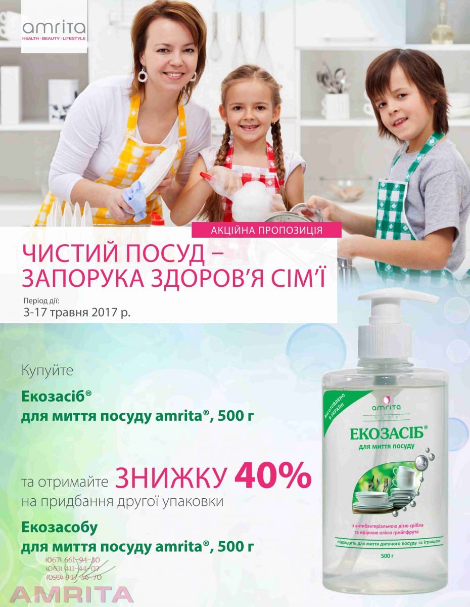 Редко можно найти в нашу эпоху высоких скоростей и технологий - человека который скажет: "Для меня, мое здоровье не имеет значение!" Сейчас имеет значение Бренд и Экспертная оценка независимых Экспертов. Компания Амрита, стоит на страже нашего с Вами здоровья и предлагает Вам Эко средство , рекомендованное Ассоциацией аллергологов Украины.: Экосредство для мытья посуды. Для того что бы во время предстоящих праздников, Ваша посуда не только сияла, но была, чистой и безопасной ГК"Амрита" подготовила для Вас : Акционные предложения - Май 2017 Только с 03 по 17 мая 2017 г. : Предназначено для мытья всех видов посуды.