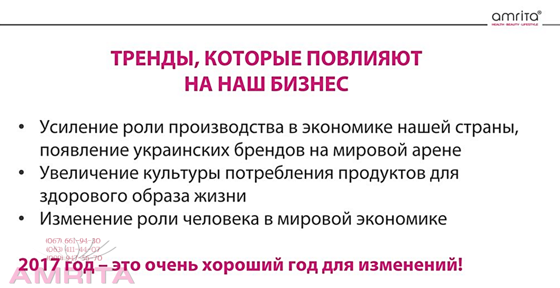 Для многих кто мечтает, о чем то серьезном стало актуально быть в тренде. Быть в тренде означает «идти в ногу со временем» и оставаться в курсе самых последних новинок в данной области. Тренд сезона это направление, в котором развивается данная область в текущем сезоне, а также главная фишка этого направления. Компания Амрита задает тренд 2017 года.