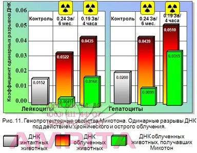 • комплексний вибірковий біосорбент для очищення організму; • імунокоректор для підтримки і відновлення природних захисних сил організму; • антиоксидант для захисту клітин від агресивного впливу вільних радикалів. Доведено, що «Мікотон» володіє генопротекторнимі властивостями, захищає організм на рівні ДНК (ДНК – одна з найважливіших для живих істот молекула, в якій міститься вся генетична інформація про організм, від стану якої прямо залежить здоров'я і тривалість життя організму). Прийом «Мікотону» захищає ДНК від руйнувань, а при опроміненні, впливі температурного стресу або ультрафіолетових променів, різних мутагенів сприяє відновленню структури ДНК.