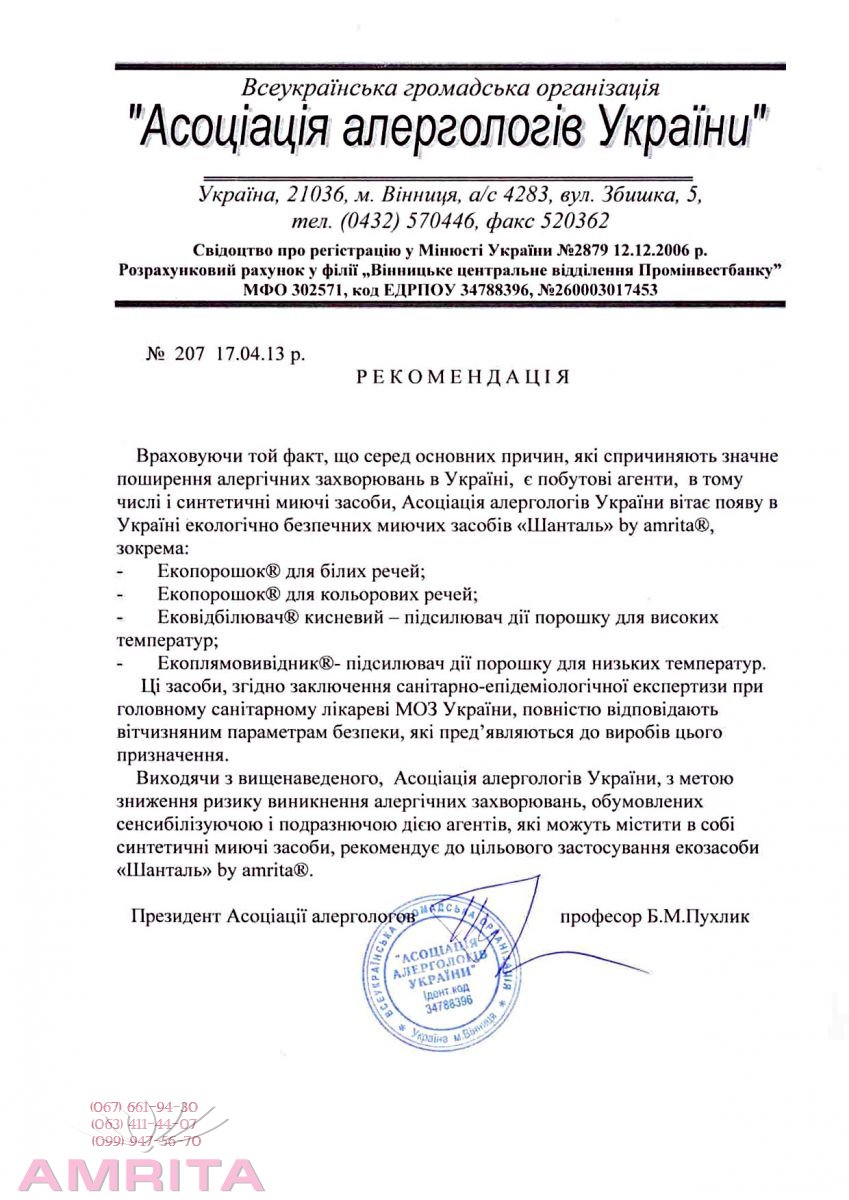 Экосредства «Шанталь»® от Компании «Амрита» получили одобрение и рекомендацию для целевого использования от Ассоциации аллергологов Украины. «Учитывая тот факт, что среди основных причин, которые влияют на значительное распространение аллергических заболеваний в Украине являются бытовые агенты, в том числе и синтетические моющие средства, Ассоциация аллергологов приветствует повяление в Украине экологических безопасных моющих средств «Шанталь» ® от Компании «Амрита». С целью снижения риска возникновения аллергических заболеваний, обусловленных сенсибирующими и раздражающими действиями агентов, которые могут содержать в себе синтетические моющие средства, Ассоциация рекомендует для целевого использования Экосредства «Шанталь»® by amrita®». Экосредства «Шанталь»® от Компании «Амрита» – первая и пока единственная торговая марка моющих средств, рекомендованная для целевого использования Ассоциацией аллергологов Украины. Посмотрите материалы с пресконференции в УНИАН: Дата публикации 06.06.2013.