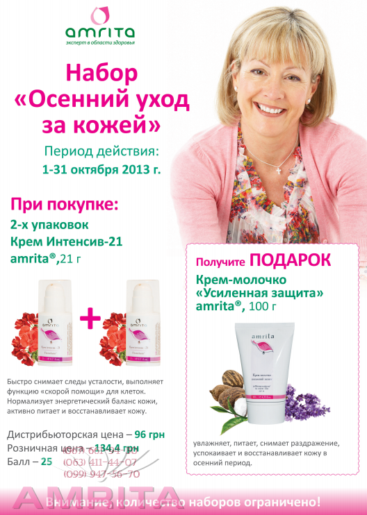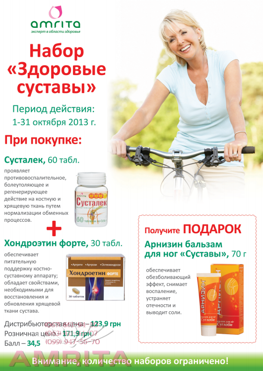 Осень вошла в свои права, дни становятся короче, воздух по утрам прохладный, даже морозный, солнце все меньше радует своим теплом – природа постепенно начинает готовиться к зиме. Самое время и Вам начать интенсивную подготовку к зиме, укрепляя иммунитет и заботясь о правильном уходе за кожей. Компания «Амрита» подготовила для вас несколько наборов для укрепления здоровья и поддержания естественной красоты, которые будут особенно актуальными в переходной осенний период. При покупке: Сусталек, 60 табл. – проявляет противовоспалительное, болеутоляющее и регенерирующее действие на костную и хрящевую ткань путем нормализации обменных процессов. Участвуя в Акции 2013 года- октябрь : Вы получаете в подарок : крем- гель для суставов "арнизин" , 70 гр.