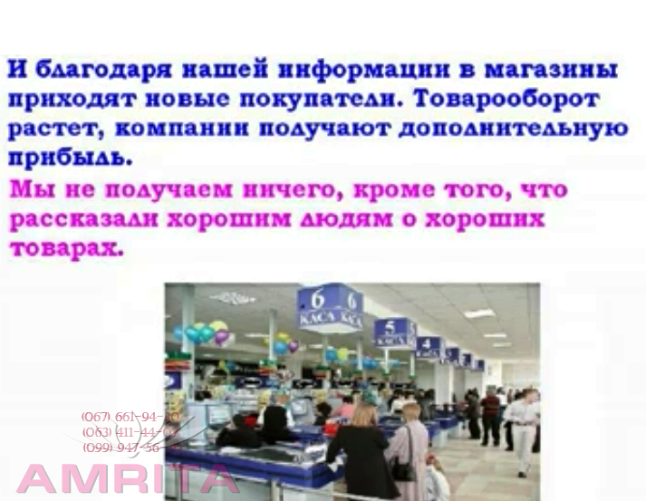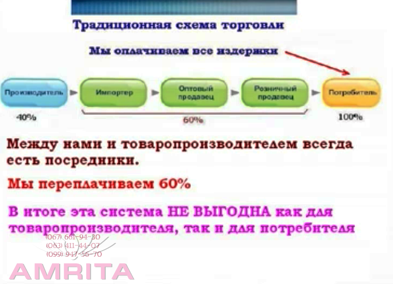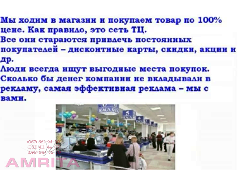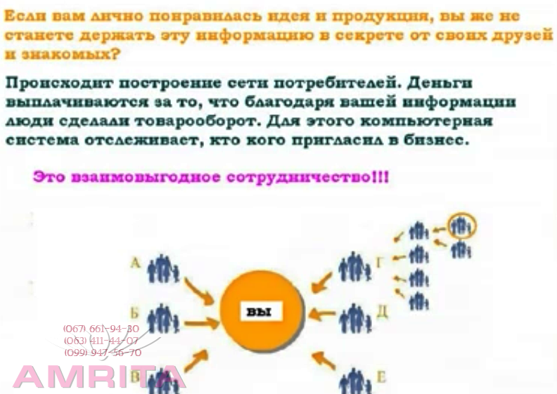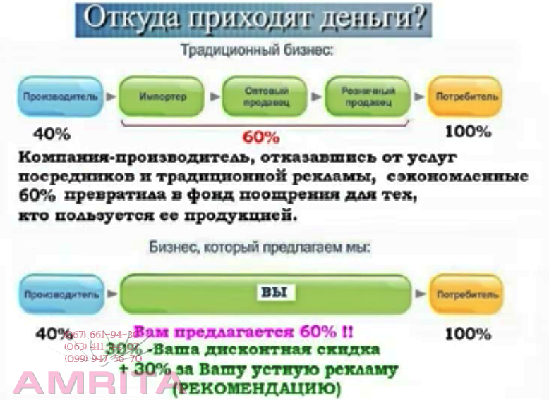 А, люди говорят, что таких бонусов, таких легких условий квалификаций, как в Амрите нет нигде! А, как % выплат в Амрите, он выше или ниже конкурентов? Для этого рассмотрим возможный доход и возможность привлекать новых партнеров: Как мы видим в компании Амрита, осуществлять свои мечты легче! Как работает млм бизнес компании Амрита? Рассмотрим откуда берутся деньги в млм компаниях на выплаты бонусов и почему в компании Амрита они выше? В компаниях млм- эти 60 % идут на оплату бонуса, скидки ДБ. Мы категорически против этой модели, т.к. она носит характер финансовой пирамиды. В компании Амрита, сразу не зависимо от закупки, вы получаете 30% скидки от розничной цены каталога! Ниже будет показаны, 6 видов дохода в Амрите. А, пока разберемся откуда приходят деньги? В компании Амрита 6 видов доходов: 1. Самая большая экономия – с Клубной картой «Амрита». Это возможно только в «Амрите»! 2. Самый простой способ получать устойчивый дополнительный доход – приглашайте новых Членов Клуба, заинтересованных в продукции или в дополнительном доходе. Совет: найдите хотя бы одного человека, который, также как и Вы, заинтересован в дополнительном доходе, и обеспечьте себе устойчивый дополнительный доход. И помните: Вы делаете Бизнес в Амрите для себя! Но, не сами по себе! У Вас есть спонсорская линия ( человек который пригласил Вас и вышестоящие партнеры вашей ветки). От того, как полнее, качественнее вы возьмете навыки и опыт этих людей себе на вооружение- будет зависеть ваше развитие. Есть одно НО! Беря навыки и опыт партнеров, Вы должны помнить, все это станет вашим только тогда, когда вы добавите маленький штрих, что то свое, от себя. Немного того что начинается в душе и проходит через ценности. Например : Ваш наставник проводит занятия в боксерских трусах, Вы используя те же навыки проводите занятие в розовом кимоно с присущем только вам шарму и любви к людям. Теперь серьезно: Знания которые мы получали, в школе, ПТУ, армии, Университете, кем то написаны и переработаны учителем и получены Вами. В Амрите, как в жизни, вы берете полезные вам знания и перерабатываете их в свои. 3. Самые надежные инвестиции своего времени в собственный бизнес – формирование команды Лидеров. Совет: сформируйте команду из пяти Лидеров, ориентированных на создание собственного бизнеса с Компанией и получите стабильно растущий бизнес и финансовую независимость. Компания «Амрита» предоставляет возможность передать свой бизнес по наследству и тем самым обеспечить будущее своим детям и близким. 4. НОВОЕ БИЗНЕС-ПРЕДЛОЖЕНИЕ: Создавайте бизнес «под ключ» путем открытия Сервисного пункта или офиса VIP-Лидера. 5. Программа поддержки новичков на старте : "Здоровье и красота с Амритой".