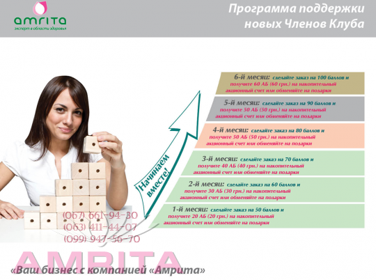 2 – й месяц: Сделайте заказ на 60 и более баллов и получите 30 акционных баллов (30 грн.). 3 – й месяц: Сделайте заказ на 70 и более баллов и получите 40 акционных баллов (40 грн.). 4 – й месяц: Сделайте заказ на 80 и более баллов и получите 50 акционных баллов (50 грн.). 5 – й месяц: Сделайте заказ на 90 и более баллов и получите 50 акционных баллов (50 грн.). 6 – й месяц: Сделайте заказ на 100 и более баллов и получите 60 акционных баллов (60 грн.). Всего за 6 месяцев вы накапливаете 250 акционных баллов или 250 грн. Накопительный акционный счет - счет, на который переносятся акционные баллы, накопленные во время участия в Программе.