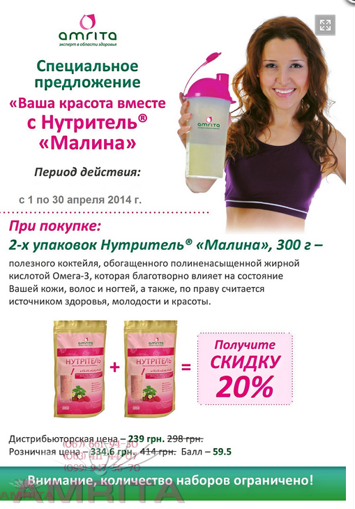 Специальное предложение от Компании «Амрита» поможет очистить организм, откорректировать вес, а также улучшить состояние кожи, ногтей и волос. При покупке: ВЫ ПОЛУЧАЕТЕ СКИДКУ 20%!!! Рекомендуется как полноценный заменитель одного приема пищи для контролирующих свой вес! Источник незаменимой полиненасыщенной кислоты Омега-3.