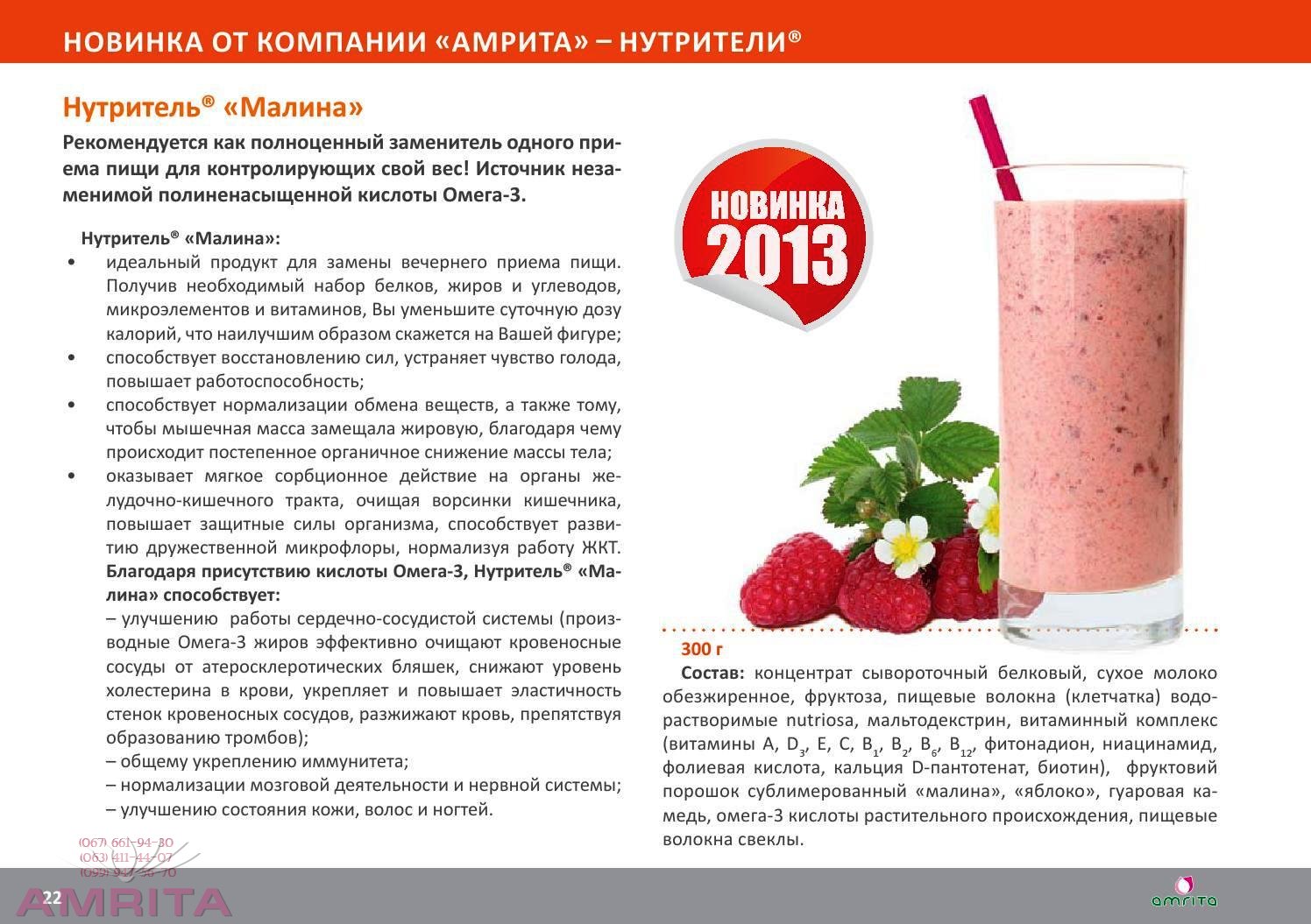 Нутритель® «Малина»: Упаковка: 300 г Нутритель® "Малина" содержит 16 аминокислот и 13 витаминов. Нутритель® «Малина» обогащен полиненасыщенной жирной кислотой Омега-3(источник -морские водоросли Ulkenia), действие которой: способствует выработке коллагена и эластина, что позволяет коже выглядеть молодой и сияющей, питает волосяные фолликулы, делая волосы сильными и блестящими, ускоряя их рост, укрепляет ногтевые пластины, делая их менее ломкими; способствует общему укреплению иммунитета. оказывает позитивную работу на сердечно-сосудистую систему – способствует очищению кровеносных сосудов от атеросклеротических бляшек, снижает уровень холестерина в крови, оказывает позитивное влияние на стенки кровеносных сосудов, повышая их эластичность, разжижает кровь, препятствуя образованию тромбов; Основные действующие компоненты: концентрат сывороточный белковый (сывороточный протеин), сухое молоко обезжиренное, фруктоза, пищевые волокна (клетчатка) водорастворимые, комплекс витаминов (витамины А, D3, Е, С, В1, В2, В3, В6, В7, В12, К, Н, фолиевая кислота, кальция D-пантотенат), фруктовый порошок малины, яблока, омега-3 кислоты растительного происхождения (докозагексаеновая кислота), пищевые волокна свеклы, пектин.
