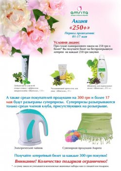 Покупая до 17 МАЯ продукцию компании "Амрита" на 250 грн. + - Вы гарантированно получаете подарок: