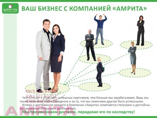 С 21 мая 2014 года стартует акция «Бесплатная регистрация для новых Членов Клуба»: при единоразовой покупке продукции из ассортимента Компании «Амрита» оти более баллов в Центре обслуживания клиентов Вы получаете прекрасную возможность получить в подарок Регистрационный пакет документов. В пакет документов входит бланк договора, Клубная карта, каталог продукции и прайс-лист. Также напоминаем, что каждый Новый Член Клуба, набрав от 50 баллови более в первых два месяца регистрации, автоматически становится участником «Программы для Новых Членов Клуба» и сможет получит дополнительное вознаграждение уже с первого месяца регистрации в Компании. Спешите воспользоваться предложениями от Компании «Амрита» - активно приглашайте «новичков», развивайте свою структуру и вместе получайте бонусы и вознаграждения. С момента регистрации в Компании Амрита и на протяжении 6 месяцев действия Программы поддержки Новых членов Клуба приобретайте для себя и своих близких продукцию из широкого ассортимента продукции Компании Амрита, который в себя включает: Освоена наглядная и дополненная презентация с мотивационными коментариями: Три бизнес программа с 1 марта 2014 г Таким образом с Марта 2014 года Маркетинг План компании «Амрита» - Стал Народным! Впервые в истории МЛМ, компанией «Амрита» - предложен маркетинг план и для лидеров сети и для обычных потребителей, с равными возможностями в бизнесе! Подробнее: ----->>>>