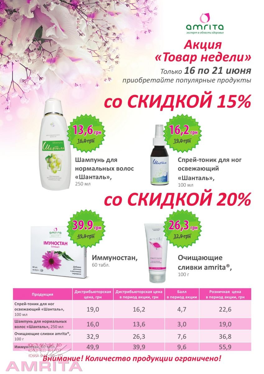 Компания «Амрита» предлагает супервыгодные цены на популярные и актуальные продукты. Настоящая летняя жара придет в Украину во второй декаде июня, а в первой декаде ожидается переменчивый характер погоды по всей территории Украины. Об этом заявил директор Украинского гидрометеорологического центра МЧС Украины Николай Кульбида. "В первой декаде июня погода в Украине будет переменчивой. Будут меняться атмосферные фронты, которые будут проходить один за другим. И, таким образом, высокого температурного режима в первой декаде мы не ожидаем. Будет преимущественно температура от 18 до 25 градусов тепла в дневные часы и ночная температура от 7 до 14 градусов тепла", - подчеркнул он. Кроме того, по его словам, в первой декаде осадков будет немного, но они все же будут время от времени. "Относительно дальнейшего развития, то здесь сложно говорить, но однозначно, что после такого умеренного температурного режима первой декады июня, я считаю, что следует ожидать уже более высоких температур именно во второй декаде июня", - добавил он. И хотя аномальной жары в Украине все же не ожидается! -Мы хотим Вас согреть нашим теплом и дарим Вам скидки: Со скидкой 15%: Шампунь для нормальных волос с экстрактом винограда и зеленого чая (250 мл.)