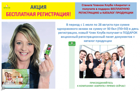 Используйте Информационный лист сами и передавайте информацию Членам Клуба из Вашей структуры, и будьте в курсе самых последних новостей! Бесплатная регистрация в компанию" Амрита "+ Каталог в подарок! C 24 июня по 30 августа 2014 года в СП новые клиенты, желающие стать Членами Клуба «Амрита», при условии совершения покупки на 50 баллов и более (ПО≥50), смогут ЗАРЕГИСТРИРОВАТЬСЯ БЕСПЛАТНО и получить в ПОДАРОК КАТАЛОГ ПРОДУКЦИИ*! Также напоминаем, что каждый Новый Член Клуба, набрав от 50 баллов и более в первых два месяца регистрации, автоматически становится участником «Программы для Новых Членов Клуба» и сможет получить дополнительное вознаграждение уже с первого месяца регистрации в Компании. Быть ЧК компании "Амрита" выгодно: