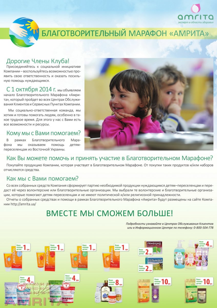 Мы социально-ответственная команда, мы хотим и готовы помогать людям, особенно в такое трудное время. Для этого у нас с Вами есть все возможности и ресурсы. Кому мы с Вами помогаем? В рамках Благотворительного Марафона мы оказываем помощь детям-переселенцам из Восточной Украины. Как Вы можете помочь и принять участие в Благотворительном Марафоне? Покупайте продукцию Компании, которая участвует в Благотворительном Марафоне. От покупки таких продуктов и/или наборов отчисляются средства. Как мы с Вами помогаем? Со всех собранных средств Компания сформирует партию необходимой продукции нуждающимся детям–переселенцам и передаст её через волонтерские или благотворительные организации. Мы выбрали те волонтерские и благотворительные организации, которые помогают детям-переселенцам и не имеют политической и/или религиозной принадлежности. Отчеты о собранных средствах и помощи в рамках Благотворительного Марафона «Амрита» будут размещены на сайте Компании . Перечень продукции, участвующей в Благотворительном Марафоне, а также плакат Вы можете увидеть. Информация о продукции, участвующей в Благотворительном Марафоне, также размещена в новом каталоге продукции, в прайс-листе и на официальном сайте Компании. ВМЕСТЕ МЫ СМОЖЕМ БОЛЬШЕ! ВАШ Шанс! Откройте ДВЕРЬ!