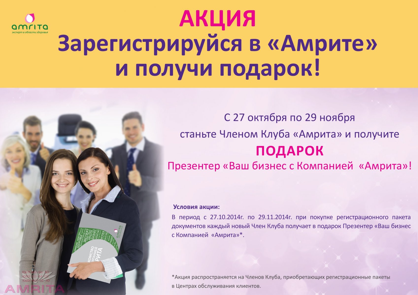 Уважаемые посетители и клиенты Первого Социального сайта "Амрита" . Информируем Вас, что с 27 октября стартует акция "Зарегистрируйся в "Амрите" и получи ПОДАРОК". В период с 27.10.2014г. по 29.11.2014г. при покупке регистрационного пакета документов каждый новый Член Клуба получает в подарок Презентер «Ваш бизнес с Компанией «Амрита». Также напоминаем, что каждый Новый Член Клуба, набрав от 50 баллов и более в первых два месяца регистрации, автоматически становится участником «Программы для Новых Членов Клуба» и сможет получить дополнительное вознаграждение уже с первого месяца регистрации в Компании. Программа для Новых Членов Клуба: " Целься в 10"! «Большие деньги заработать несложно, сложно заработать маленькие»(Наталья Водянова) Программа «Целься в десять» - как выйти на доход в 1000 долларов за 10 месяцев. Участвовать в программе могут как новые Члены Клуба, так и клиенты, vip-клиенты и директора. 1 или 2 месяц Новичок или директор становится Бизнес-Директором Доход - 125 грн. 2 месяц Новичок - Бизнес - директор (250 баллов) Подписал и обучил нового Бизнес-директора (250 баллов) ОС (объем структуры) – 500 баллов Доход 250 грн., нового партнера 125 грн. 3 месяц Новичок делает ГО 250 баллов, его 1 партнер 250 баллов и находит партнера, бизнес-директора (250 баллов), наш новичок тоже находит и обучает следующего бизнес-директора (250 баллов) Его ОС 1000 баллов, доход 500 грн., его партнеров соответственно 250 грн. и по 125 грн. Выводы: