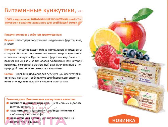 Хрустящее печенье с наполнителями перенасыщено ароматизаторами, красителями, консервантами, стабилизаторами и прочими вредными пищевыми добавками. Каждому из нас трудно отказать себе в лакомстве. Зачастую у нас нет выбора, особенно, если возникает необходимость быстро перекусить. И особенно трудно отказать в сладостях ребенку, когда Вы не можете предложить ему вкусной и одновременно полезной альтернативы. Компания Амрита» нашла решение этой проблемы и представляет Вам НОВИНКИ -вкусное и полезное лакомство для всей Вашей семьи - 100% натуральные ВИТАМИННЫЕ КУНЖУТИКИ®:
