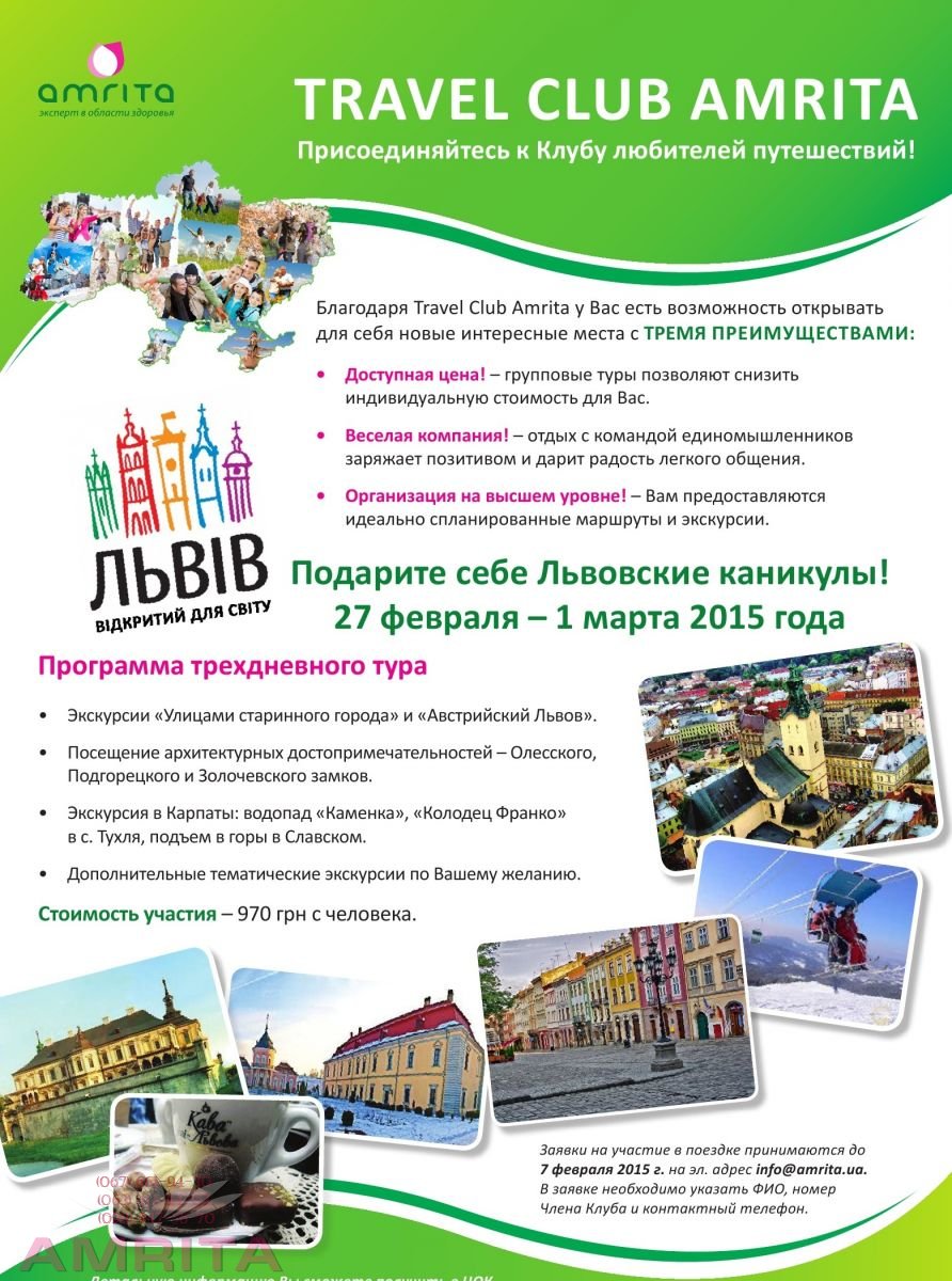 За поездку Вам начисляется 50 баллов![]() Приглашаем Вас, Ваших родных и друзей принять участие в первой в этом году поездке в рамках клуба любителей путешествий «Трэвел Клуб Амрита ». Поездка «Львовские каникулы» состоится 27 февраля - 1 марта 2015 г .