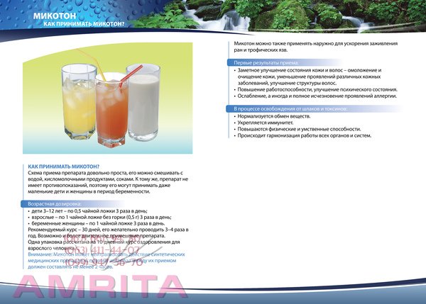 Микотон является первым шагом на пути к комплексному оздоровлению. Очистив все среды организма от внешних и внутренних шлаков, Вы можете подготовить организм к дальнейшему укреплению здоровья. Для поддержания организма в здоровом состоянии, прием МИКОТОНА должен стать регулярным и каждодневным.
