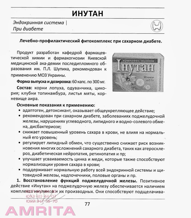 • поддерживает нормальную работу всей эндокринной системы и щитовидной железы, надпочечники, половые органы и пр. 1. Восстановление функций поджелудочной железы. Позитивное действие «Инутан» на поджелудочную железу обеспечивается наличием комплекса инулинов и их производных. Они способствуют подщелачиванию внутренней среды организма, т.к. нормальный обмен глюкозы возможен только в слабощелочной среде. Сахарный диабет. Комплекс, инулинов, содержащийся в продукте, снижает повышенный уровень сахара в крови, не влияя на нормальный его уровень. Регулирует липидный обмен, что существенно снижает риск возникновения многих осложнений сахарного диабета, таких как атеросклероз, диабетическая нейропатия, импотенция, ретинопатия и т.д. Улучшает усваиваемость организмом таких минералов как цинк и медь, которые также способствуют снижению уровня сахара в крови. «Инутан» снижает нагрузку на инсулярный аппарат, оказывает избирательное детоксицирующей действие, что важно для профилактики и комплексного лечения сахарного диабета обоих типов.