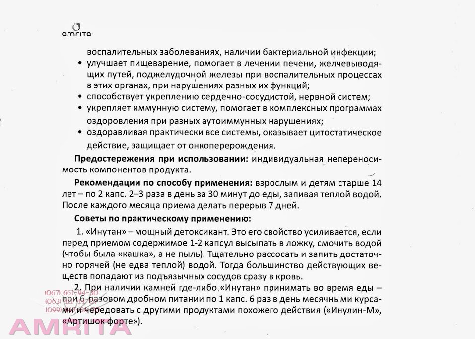 • оздоравливая практически все системы/оказывает цитостатическое действие, защищает от онкоперерождения. Предостережения при использовании: индивидуальная непереносимость компонентов продукта. , Рекомендации по способу применения:взрослым и детям старше 14 лет - по 2 капе. 2-3 раза в день за 30 минут до еды, запивая теплой водой. После каждого месяца приема делать перерыв 7 дней. Советы по практическому применению: 1. «Инутан» - мощный детоксикант. Это его свойство усиливается, если перед приемом содержимое 1-2 капсул высыпать в ложку, смочить водой (чтобы была «кашка», а не пыль). Тщательно рассосать и запить достаточно горячей (не едва теплой) водой. Тогда большинство действующих веществ попадают из подъязычных сосудов сразу в кровь. 2. При наличии камней где-либо, «Инутан» принимать во время еды - при 6-разовом дробном питании по 1 капе. 6 раз в день месячными курсами и чередовать с другими продуктами похожего действия («Инулин-М», «Артишок форте»).