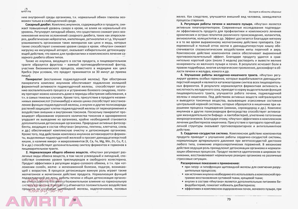 Также из инулина, входящего в состав продукта, в пищеварительном тракте образуется фруктоза - важный противодиабетический фактор, участник биохимического процесса, известного в медицине как цикл Кребса (при условии, что продукт принимается за 30 минут до приема пищи). Панкреатит (воспаление поджелудочной железы). При обострении панкреатита комплекс инулинов обеспечивает подавление излишней ферментной активности поджелудочной железы, способствуют затуханию воспалительного процесса и устранению болевого синдрома, поэтому препарат можно назначать даже в периоды обострения заболевания, в т.ч. в самых тяжелых случаях. Кроме того, присутствие в продукте незаменимых аминокислот (топинамбур) и ионов цинка способствует восстановлению функции поджелудочной железы, а инулин и другие полисахариды растений защищают клетки поджелудочной железы от перенапряжения и воздействия внешних и внутренних токсинов. Поскольку панкреатит провоцирует образование огромного количества токсинов и одновременно ухудшает их выведение из организма, крайне необходимой становится дополнительная детоксикация организма. Природные активные фитосорбенты, входящие в состав «Инутана» (инулины, пектины, клетчатка, слизь и др.) обеспечивают комплексную очистку и детоксикацию организма. Кроме того, под действием комплекса инулинов активизируются ферменты, выделяемые поджелудочной железой в просвет двенадцатиперстной кишки, а наличие микро- и макроэлементов (К, Са, Fе, Mg, Мn, Zn, Cu, P, J, Si и др.) способствует дополнительному синтезу ферментов и гормонов в пищеварительном тракте. 2. Нормализация общего обмена веществ. «Инутан» регулирует различные виды обмена веществ, в том числе углеводный и липидный, способствуя снижению уровня триглицеридов и свободного холестерина. Продукт эффективен в регуляции водно-солевого обмена, в т.ч. при «от-ложении солей», желче и мочекаменной болезни, подагре, возникающей с возрастом. В процессе детоксикации важную роль играют также желчегонное и мочегонное действие продукта. Нормализация функций поджелудочной железы, работы печени и общая детоксикация организ-ма опосредованно оказывают положительное влияние на гормональную систему организма. В результате отмечается положительное воздействие продукта на состояние щитовидной железы, надпочечников, половых желез. Как следствие, улучшается внешний вид человека, замедляются процессы старения. 3. Регуляция работы печени и желчного пузыря. «Инутан» является активным гепатопротектором. Современные исследования подтвердили эффективность продукта для профилактики и комплексного лечения хронических и острых гепатитов различного происхождения, холангитов, ангиохолитов, холециститов и др. Эффект достигается благодаря мягкому и в то же время выраженному желчегонному действию препарата. Своевременный и полный отток желчи в двенадцатиперстную кишку обеспечивается спазмолитическим воздействием мяты перечной и аира. Комплексное действие компонентов смеси обеспечивает выраженный противовоспалительный эффект. Благодаря продукту удается в сравнительно короткий срок (около 3 недель) растворить и вывести мелкие конкременты из желчного пузыря и почек. В результате исчезают боли в правом подреберье, многие аллергические проявления, дискомфорт в области печени и желудка, изж