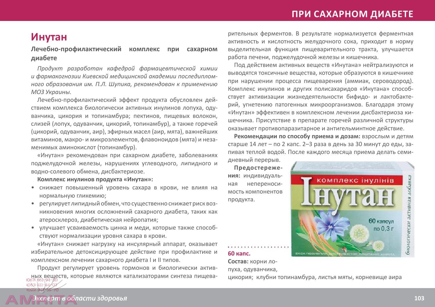 Сахарный диабет. Комплекс, инулинов, содержащийся в продукте, снижает повышенный уровень сахара в крови, не влияя на нормальный его уровень. Регулирует липидный обмен, что существенно снижает риск возникновения многих осложнений сахарного диабета, таких как атеросклероз, диабетическая нейропатия, импотенция, ретинопатия и т.д. Улучшает усваиваемость организмом таких минералов как цинк и медь, которые также способствуют снижению уровня сахара в крови. «Инутан» снижает нагрузку на инсулярный аппарат, оказывает избирательное детоксицирующей действие, что важно для профилактики и комплексного лечения сахарного диабета обоих типов.