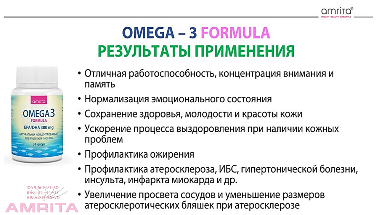 - «ОМЕГА 3 ФОРМУЛА» от Amrita, эффективно обеспечивает организм жирными кислотами EPA и DHA наивысшего качества, которые необходимы для здорового образа жизни.
