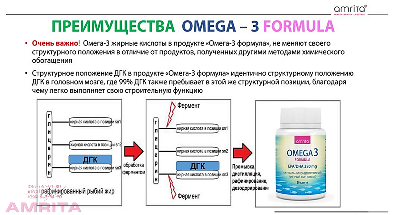 «ОМЕГА 3 ФОРМУЛА» от Amrita – это высокоэффективная формула полезных Омега-3 (ЭПК и ДГК) полиненасыщенных жирных кислот, добываемых из диких морских глубоководных рыб (анчоусовых, ставридовых, селедочных, корюшковых, скумбриевых) арктического океана. Гарантия качества, эффективности и безопасности подтверждена международными сертификатами качества GMP(API), ISO22000, GOED и репутацией мирового производителя рыбьего жира – LYSI HP, Рейкьявик, Исландия