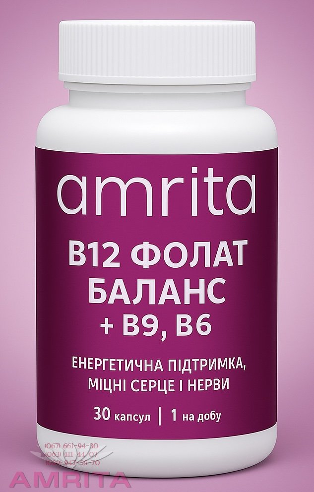 ☘️ « «В12 Фолат Баланс» від Amrita – це високоефективна тріада вітамінів групи В (В12, В9 фолат, В6) у біоактивній формі, яка сприяє покращенню обмінних процесів в організмі, підтримці нервової та серцево-судинної систем, імунітету, процесів кровотворення, профілактиці анемій, підвищенню енергії й працездатності.