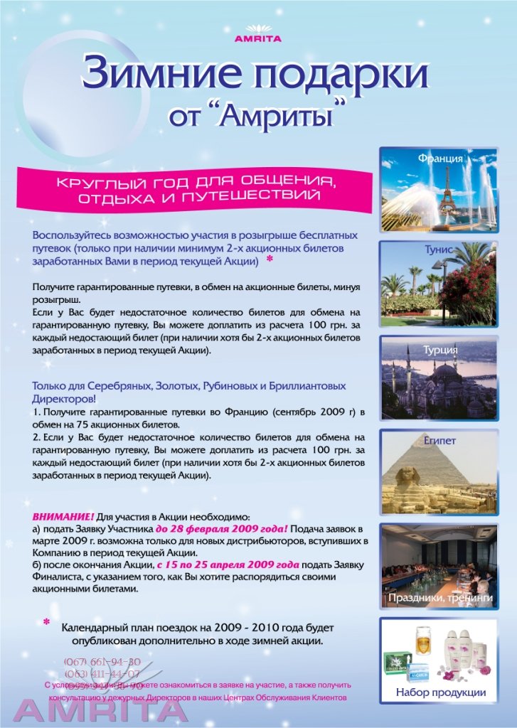Чтобы принять участие в Акции: Зимние подарки от "Амриты"- вам надо стать членом клуба компании "Амрита". Регистрационный взнос 14 грн. ВЫ получаете- Карточку члена клуба, с правом самостоятельного приобретения в 10 областных городах Украины продукцию фирмы "Амрита"-минуя интернет магазин( с фиксированной скидкой 30%).Каталог продукции, журнал, Прайс и маркетинг план. И правом участия в Акции: "Зимние подарки от "Амриты".